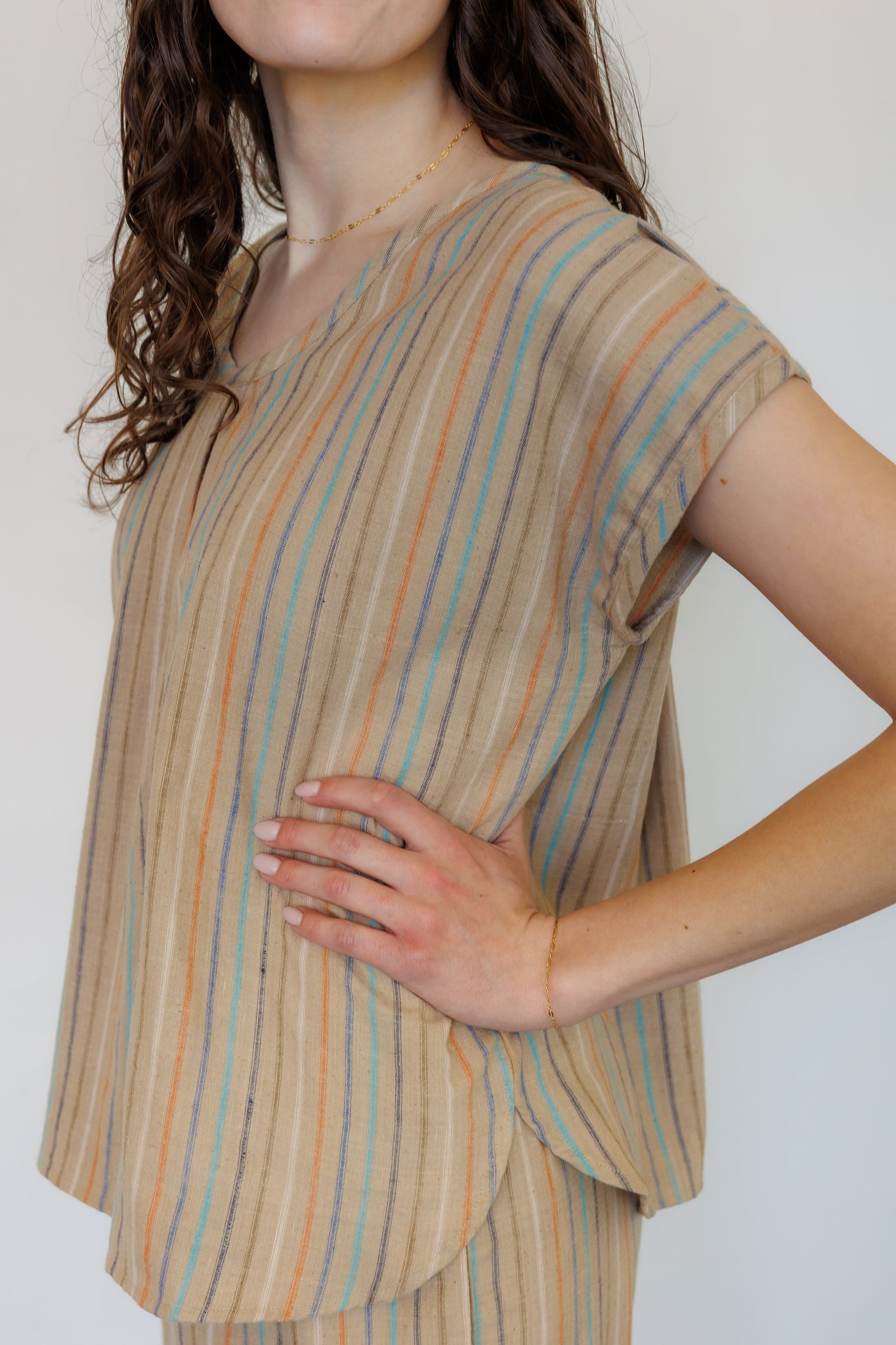 Our Oasis Shirt is made for lounging with comfort and ease-of-movement foremost of mind in its design. This reversible top features a round neckline on one side and a v-neck on the other. The v-neck features an inverted pleat for added ease in the chest and arms. A curved, vented hem completes this cozy, airy top.