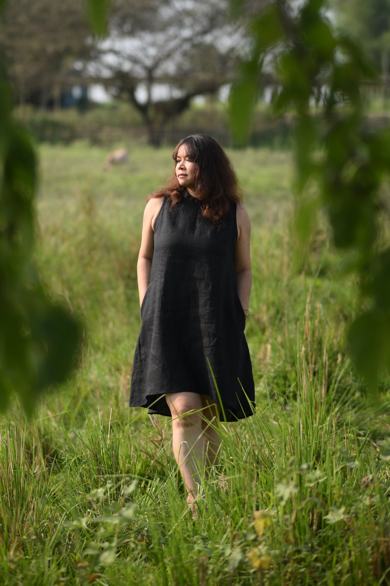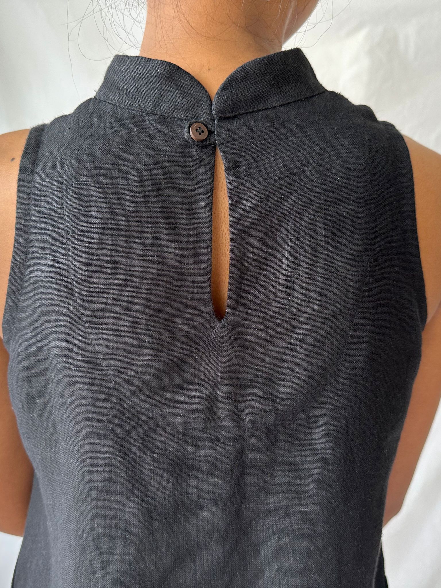 Embrace understated elegance with the Riverine Dress in 100% linen. The stand collar adds a touch of sophistication, while the sleeveless design creates an air of freedom and comfort. The keyhole button closure at the back, featuring a charming little coconut button, offers a delightful fusion of aesthetics and sustainability. The high-low hem introduces dynamic movement, making a graceful statement with every step. Plus, discover the convenience of roomy hidden pockets that seamlessly combine functionality and style.